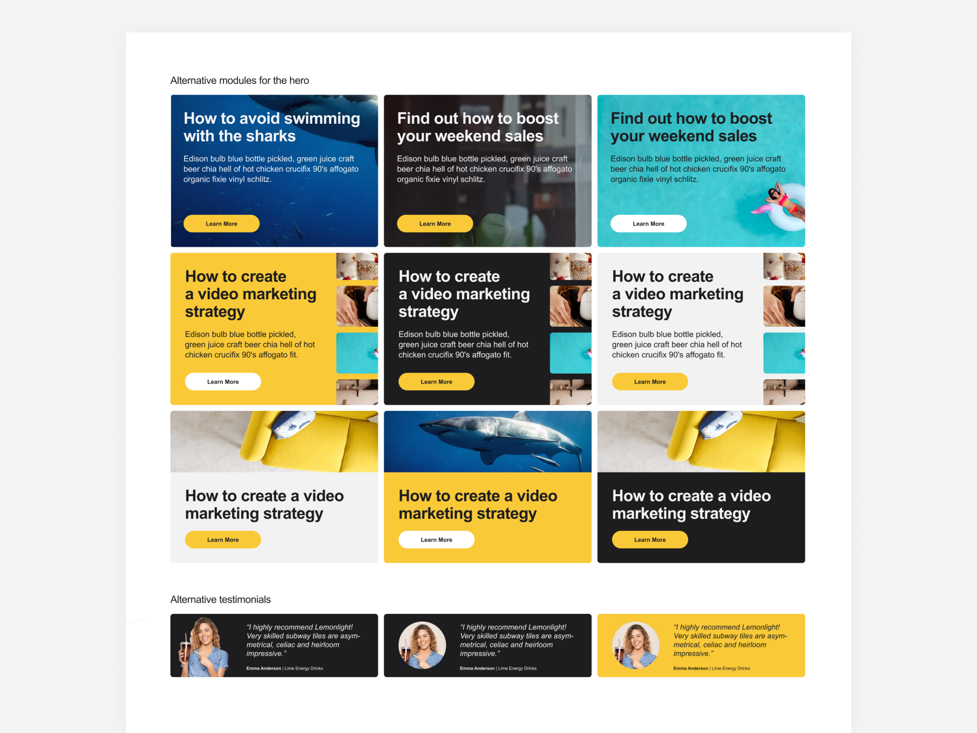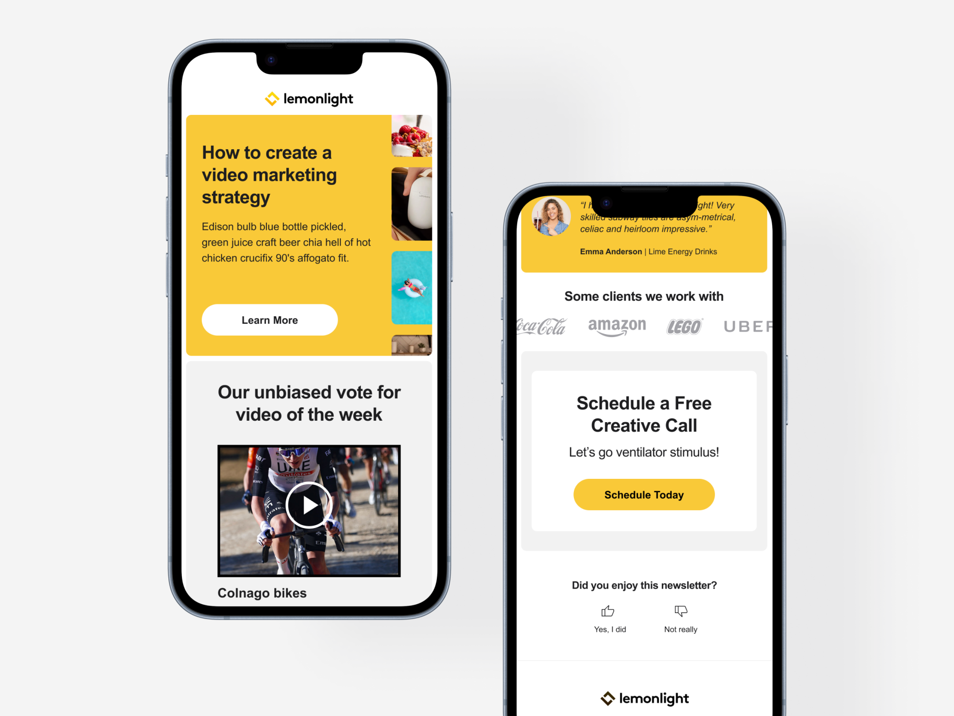 Email templates design for various Lemonlight campaigns, which included templates for follow up, and other promotional emails. Using their extended brand guide I created various sets of email templates for mobile, desktop and social use.